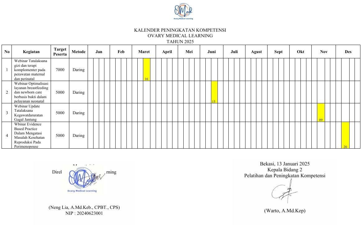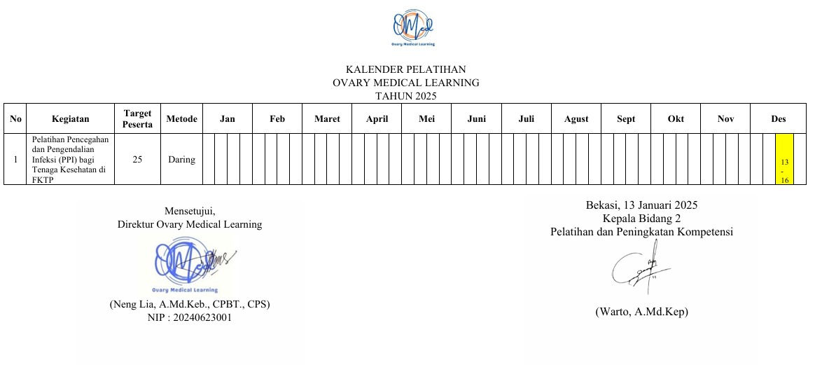 Ovary Medical Learning adalah lembaga yang bergerak di bidang pengembangan Sumber Daya Manusia (SDM) kesehatan melalui pelatihan, seminar, workshop, dan program peningkatan kompetensi. Kami hadir sebagai solusi bagi individu dan organisasi yang ingin terus belajar dan berkembang.